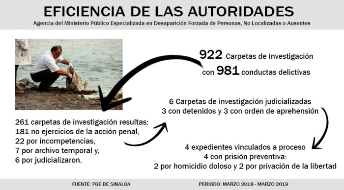 En los archivos de la Fiscalía General del Estado de Sinaloa existen diversos documentos relacionados con la desaparición forzada de personas, los expedientes datan de 2007, de 2010 y de 2014, por lo que es difícil obtener una sola cifra de carácter oficial y poder compararlas.