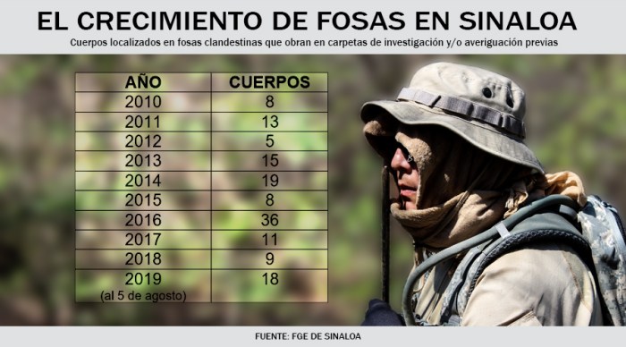 De 2014 a 2018 se contabilizaban 73 cuerpos y 173 osamentas en 140 fosas clandestinas, mientras que tan solo de enero al 19 de julio del presente año ya habían reportado 91 fosas clandestinas ubicadas en 59 lugares, con 71 cuerpos y 96 osamentas.
